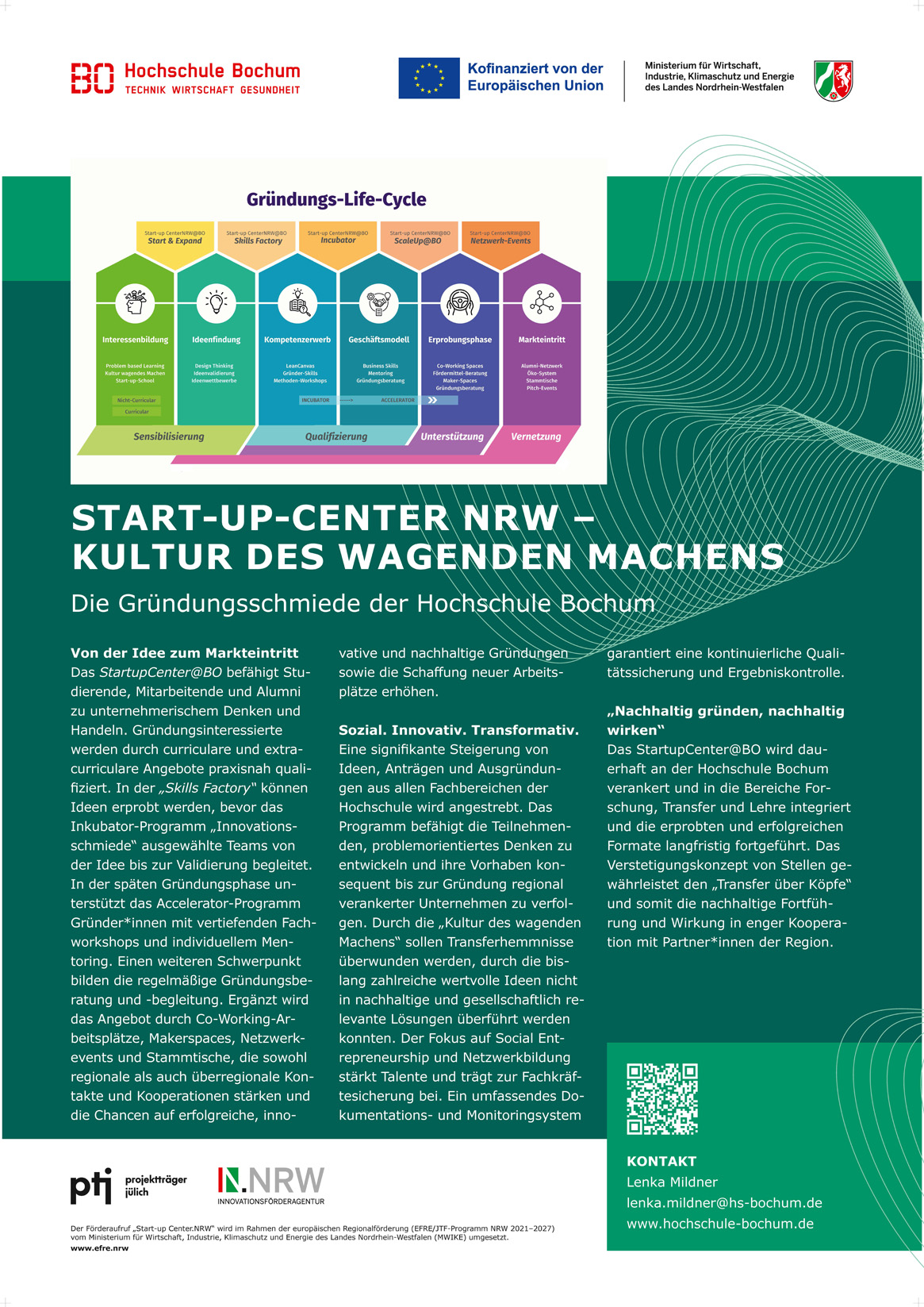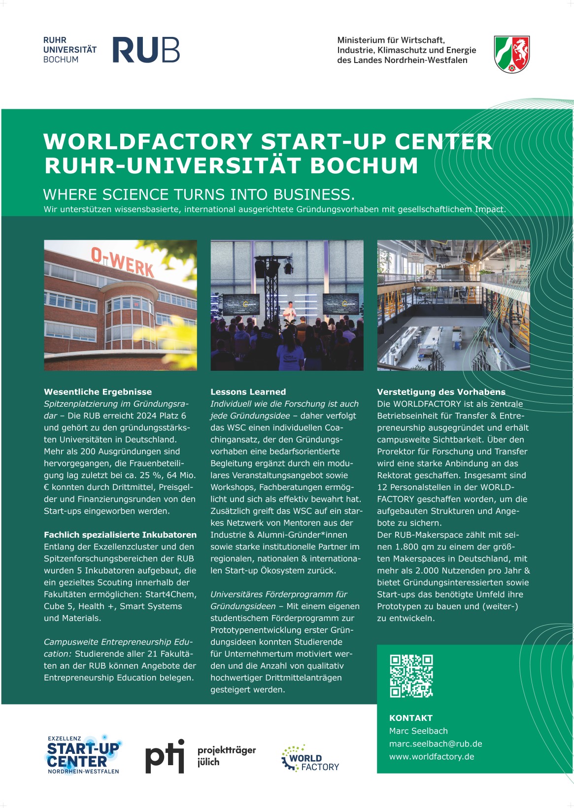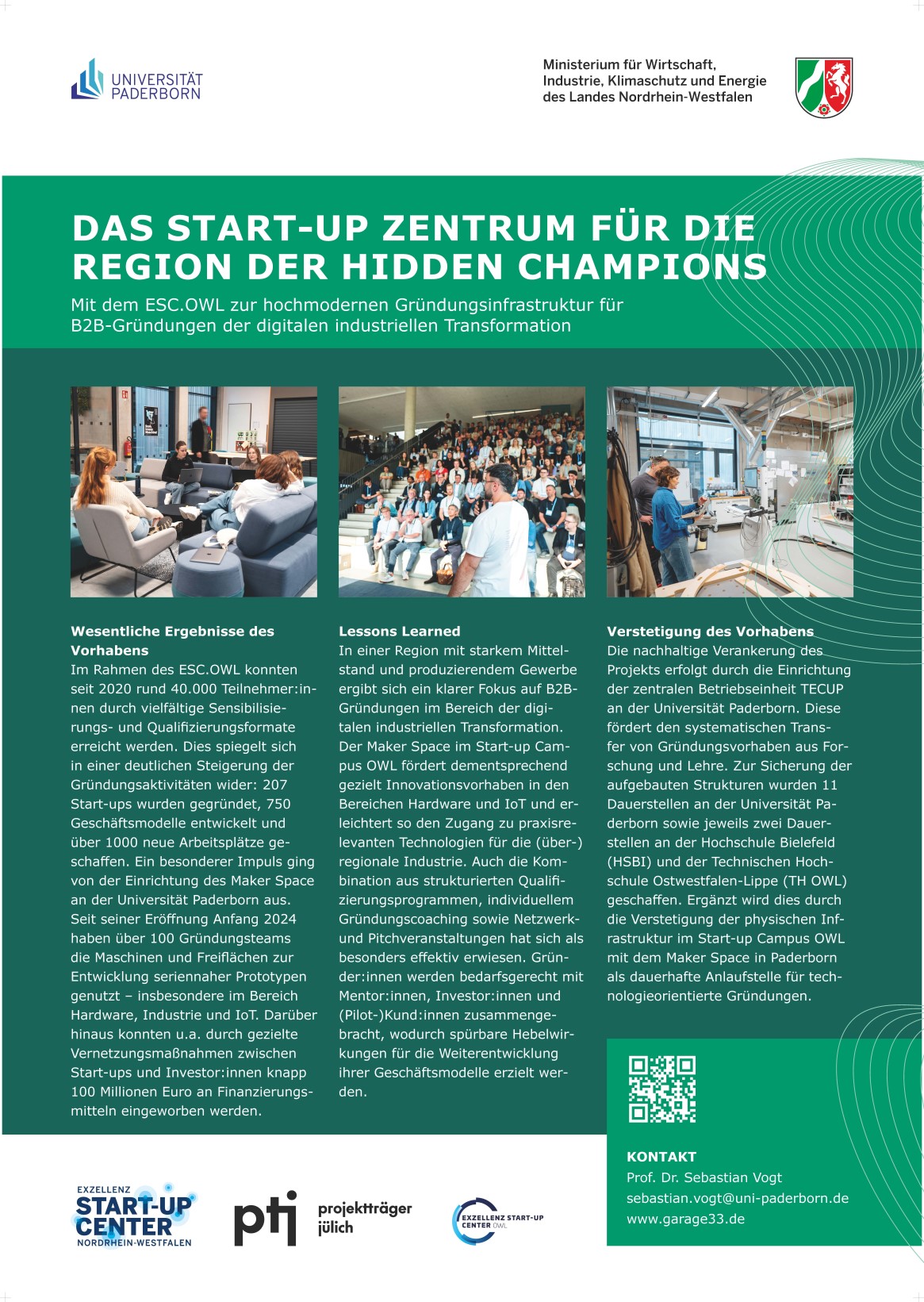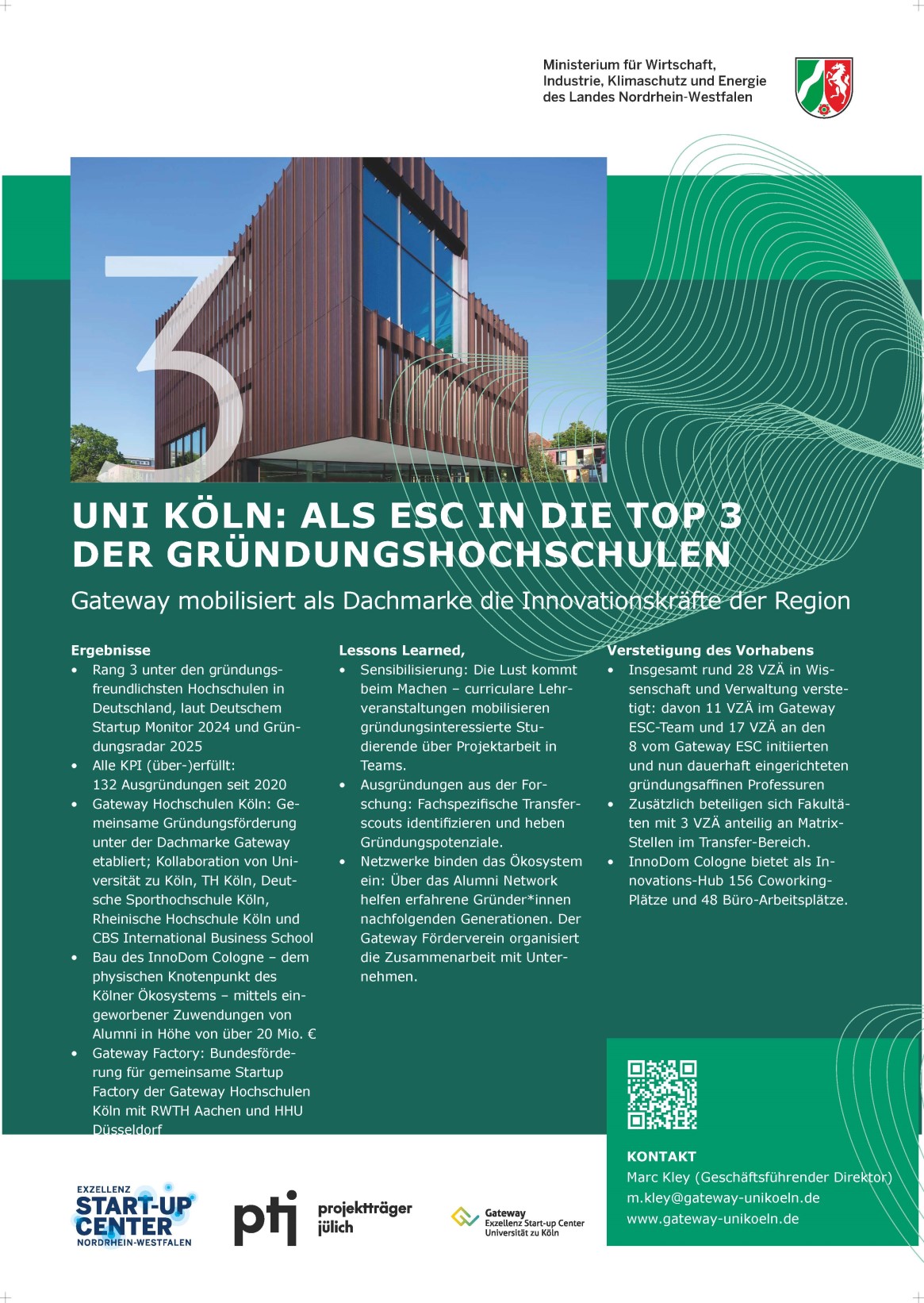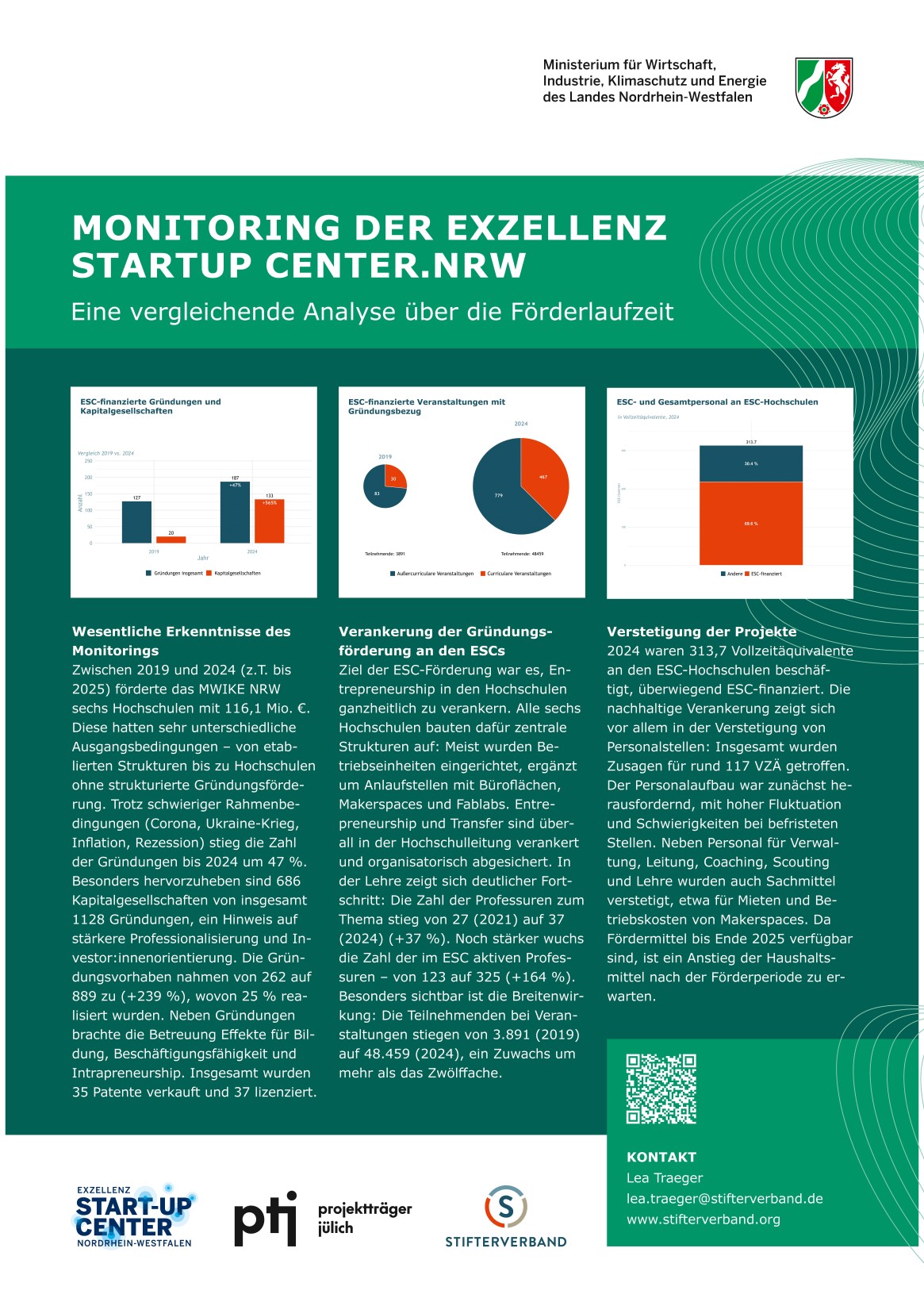 Rund 300 Teilnehmende folgten der Einladung und nutzten die Gelegenheit, den Austausch zwischen den Hochschulen in NRW zu vertiefen und das akademische Start-up-Ökosystem weiter zu stärken. In einer umfangreichen Posterausstellung konnten sie sich ein Bild von den sechs geförderten ESC-Projekten sowie ergänzenden Einzelvorhaben an fünf weiteren Universitäten machen. Ebenfalls vorgestellt wurden die zukünftigen 14 Start-up Center und drei Start-up Fokuszentren, das Programm Start-up Transfer, die Monitoringergebnisse des Stifterverbandes sowie die Qualifizierungs- und Austauschplattform für Hochschul-Coaches „smart-up.NRW“. Die Poster sehen Sie nachfolgend.