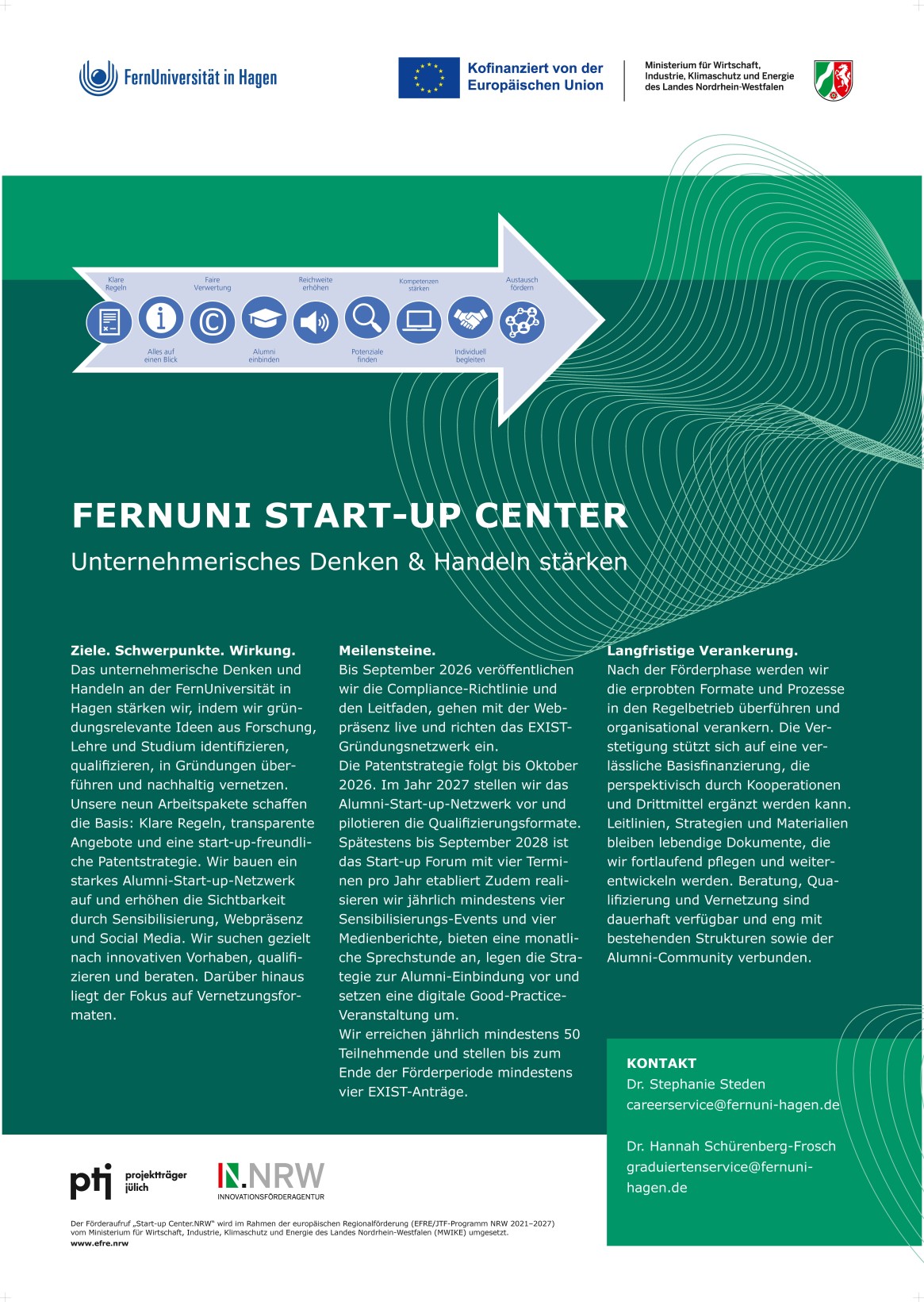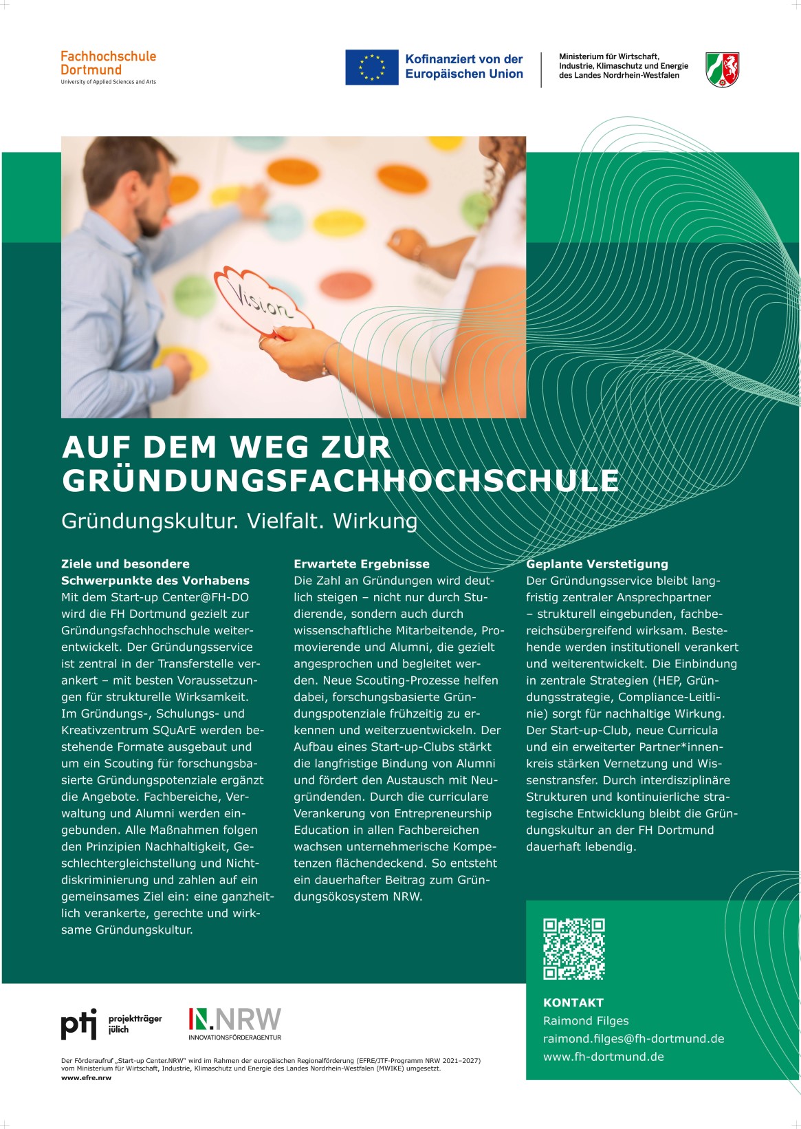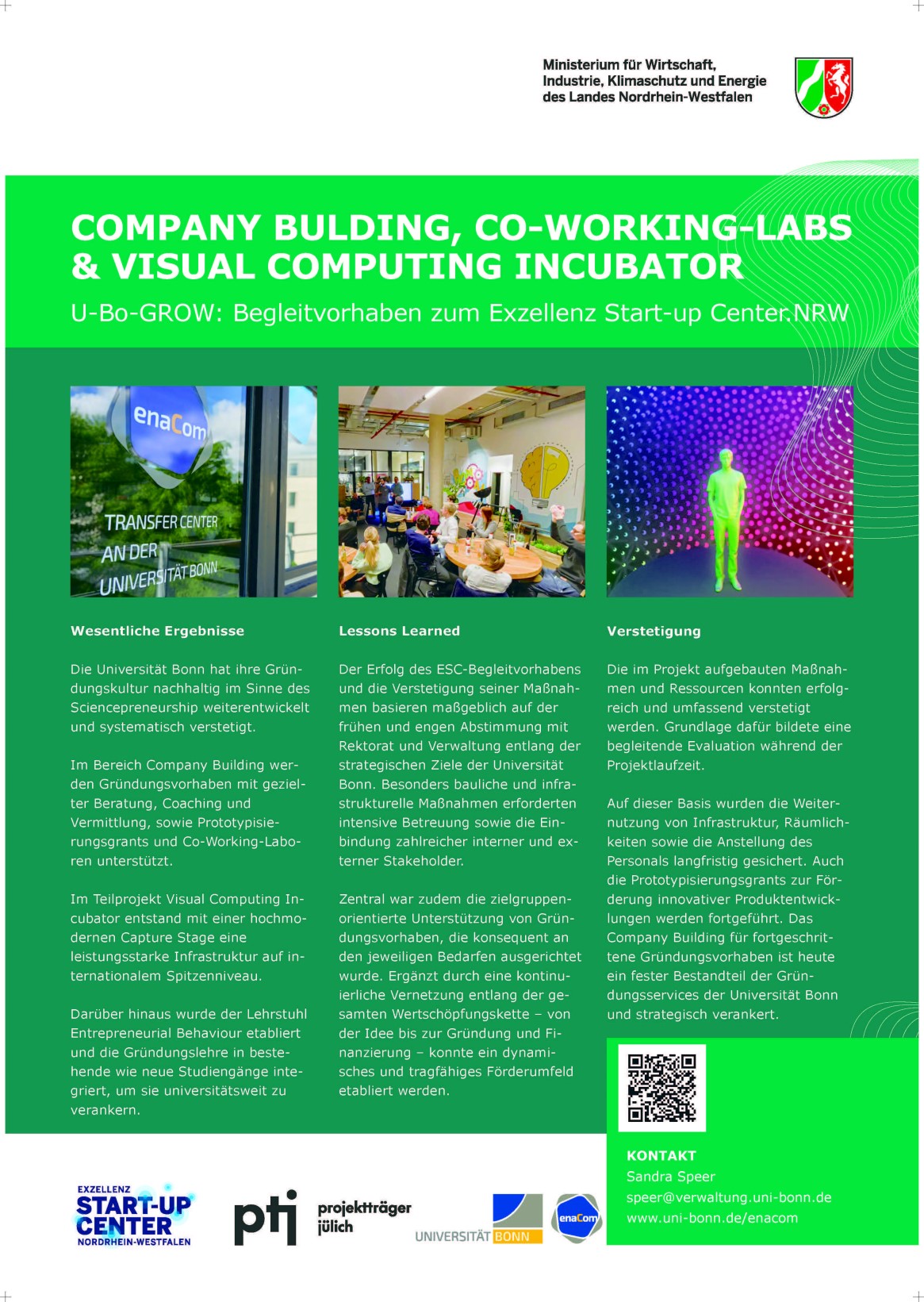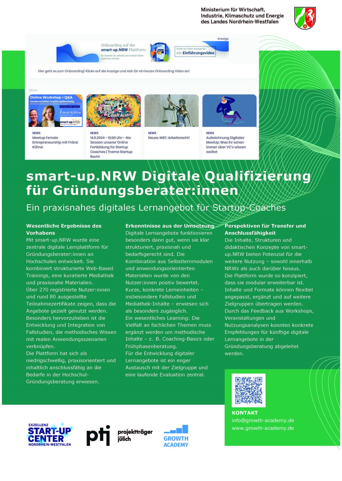 Rund 300 Teilnehmende folgten der Einladung und nutzten die Gelegenheit, den Austausch zwischen den Hochschulen in NRW zu vertiefen und das akademische Start-up-Ökosystem weiter zu stärken. In einer umfangreichen Posterausstellung konnten sie sich ein Bild von den sechs geförderten ESC-Projekten sowie ergänzenden Einzelvorhaben an fünf weiteren Universitäten machen. Ebenfalls vorgestellt wurden die zukünftigen 14 Start-up Center und drei Start-up Fokuszentren, das Programm Start-up Transfer, die Monitoringergebnisse des Stifterverbandes sowie die Qualifizierungs- und Austauschplattform für Hochschul-Coaches „smart-up.NRW“. Die Poster sehen Sie nachfolgend.