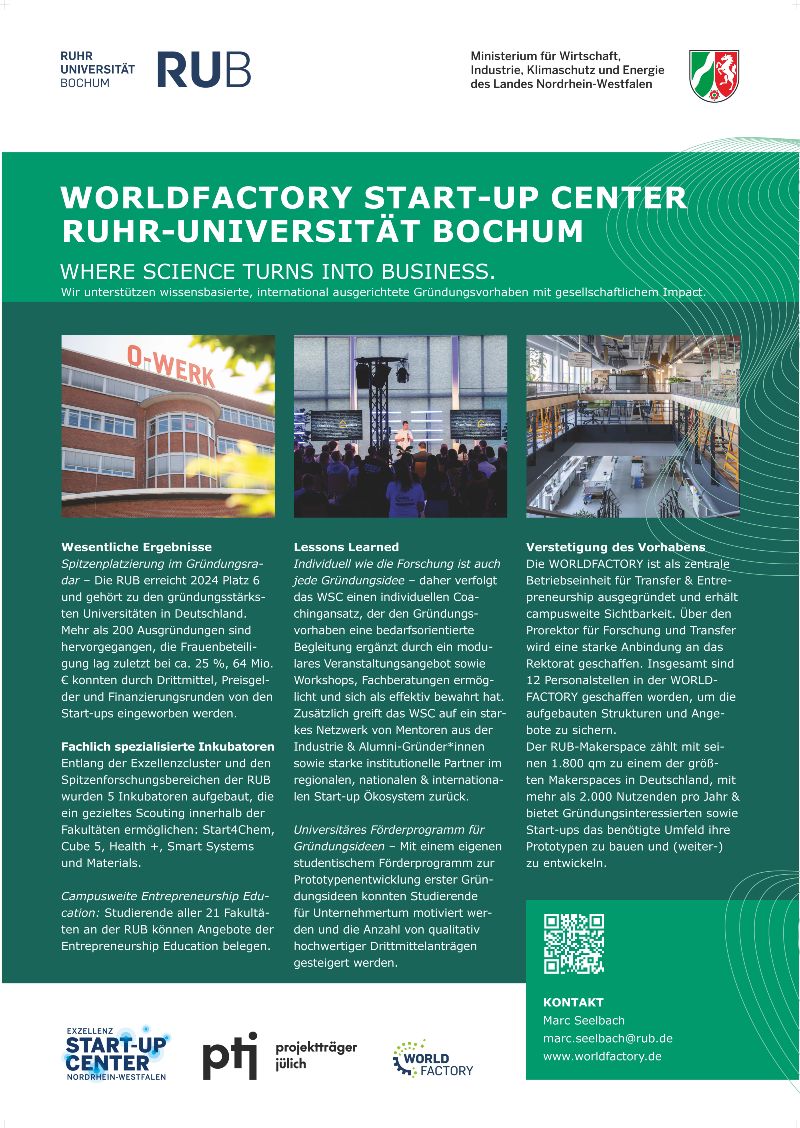 Mit der Initiative „Exzellenz Start-up Center.NRW konnte die Ruhr-Universität Bochum das WORLDFACTORY Start-up Center (WSC) zur zentralen Plattform für Gründungsförderung weiterentwickeln. Aufbauend auf der bereits etablierten Marke WORLDFACTORY bündelt die RUB nun sämtliche Unterstützungsangebote für Gründungsinteressierte unter dem Dach des WSC. Damit können künftig mehr noch als bisher Forschungsergebnisse erfolgreich in marktfähige Gründungen überführt werden. Gleichzeitig stärkt die Initiative innovative Ideen und unterstützt internationale Start-ups dabei, zu wachsen und sich zu vernetzen.