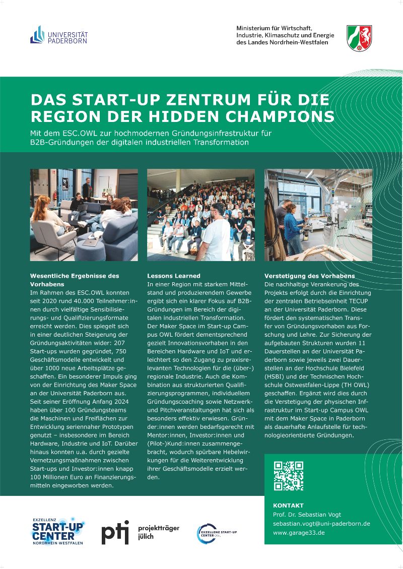 Mit Unterstützung der Förderinitiative „Exzellenz Start-up Center.NRW“(ESC) hat sich die Universität Paderborn als führender Standort für technologieorientierte Gründungsvorhaben in der digitalen Transformation etabliert. Ein klares Bekenntnis zur Gründungsförderung ist die Verankerung im Leitbild der Universität. Im Mittelpunkt steht die signifikante Steigerung von B2B-Gründungen durch enge Kooperationen zwischen der Wissenschaft und der innovationsstarken Wirtschaft in der Region Ostwestfalen-Lippe (OWL). Dafür arbeitet die Universität Paderborn eng mit der Hochschule Bielefeld (HSBI) und der Technischen Hochschule Ostwestfalen-Lippe (TH OWL) zusammen.