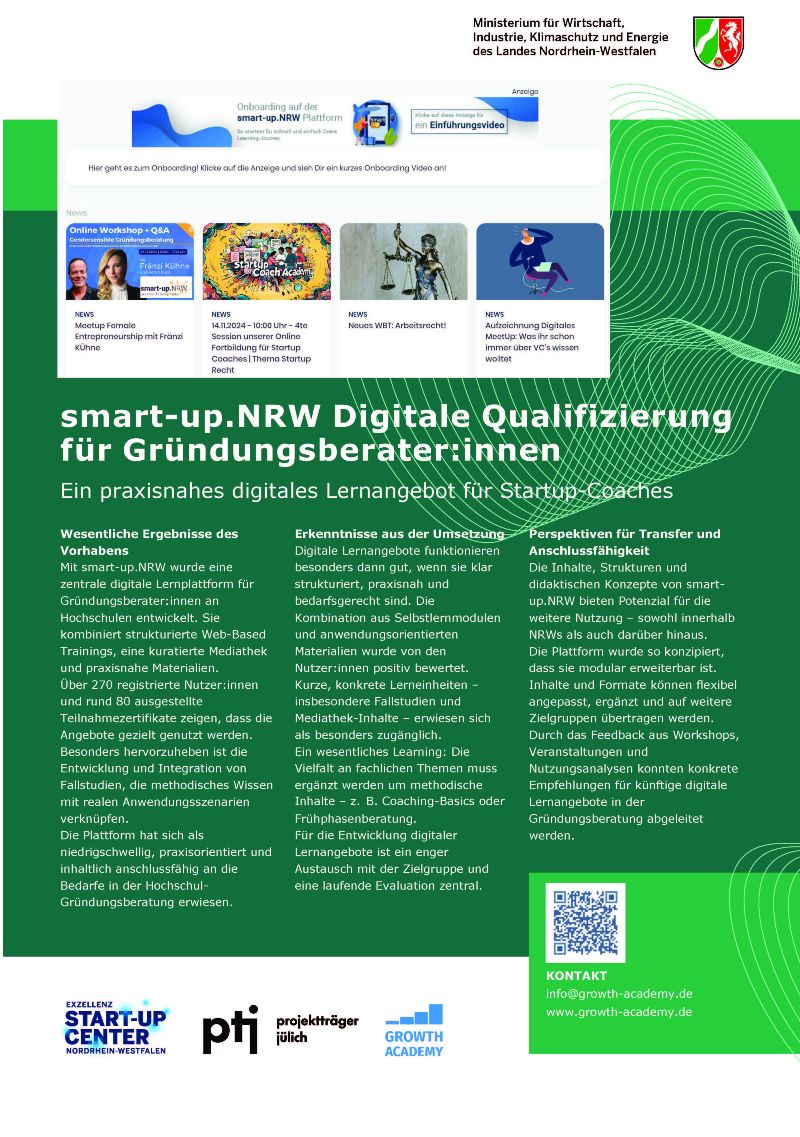 Herausgeber der Plattform smart-up.NRW ist der Projektträger Jülich bzw. das Forschungszentrum Jülich im Auftrag des Ministeriums für Wirtschaft, Industrie, Klimaschutz und Energie des Landes Nordrhein-Westfalen. Mit der Konzeption und Umsetzung wurde die Growth Academy GmbH beauftragt.