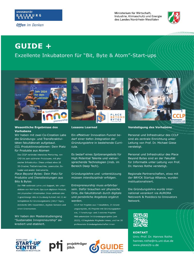 Die Förderinitiative „Exzellenz Start-up Center.NRW" hat den Gründungsgeist an der Universität Duisburg-Essen (UDE) spürbar gestärkt. Mit 3,5 Millionen Euro hat die Landesregierung Nordrhein-Westfalen das Projekt GUIDEPLUS unterstützt und damit den Ausbau des Zentrums für Gründungen und Innopreneurship (GUIDE) deutlich vorangetrieben. Ein sichtbares Ergebnis: 2022 öffneten zwei Co-Creation Labs – kreativ Entwicklungsräume, in denen gründungs- und transferorientierte Ideen zu innovativen Geschäftsmodellen reifen können.
