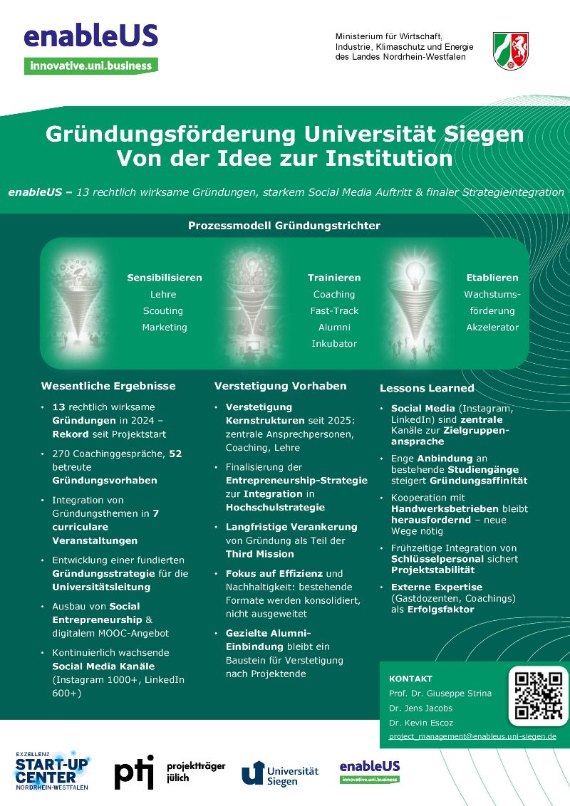 Seit über zehn Jahren unterstützt das Entrepreneurship CENTER der Universität Siegen Gründungsinteressierte aus allen Fakultäten. Ergänzend dazu fördert die Landesinitiative „Exzellenz Start-up Center.NRW“ seit 2021 das Projekt EnableUS an der Hochschule. Ziel ist es, neue Angebote zu entwickeln und vorhandene Gründungspotenziale zu aktivieren. Im Fokus stehen dabei die Begleitung von Gründungsteams aus den Bereichen Social-Entrepreneurship und Soziales Unternehmertum sowie die Betreuung von „Fast Movern“ und nicht zuletzt die Digitalisierung von Handwerksbetrieben und Identifikation nachfolgeinteressierter Studierender.