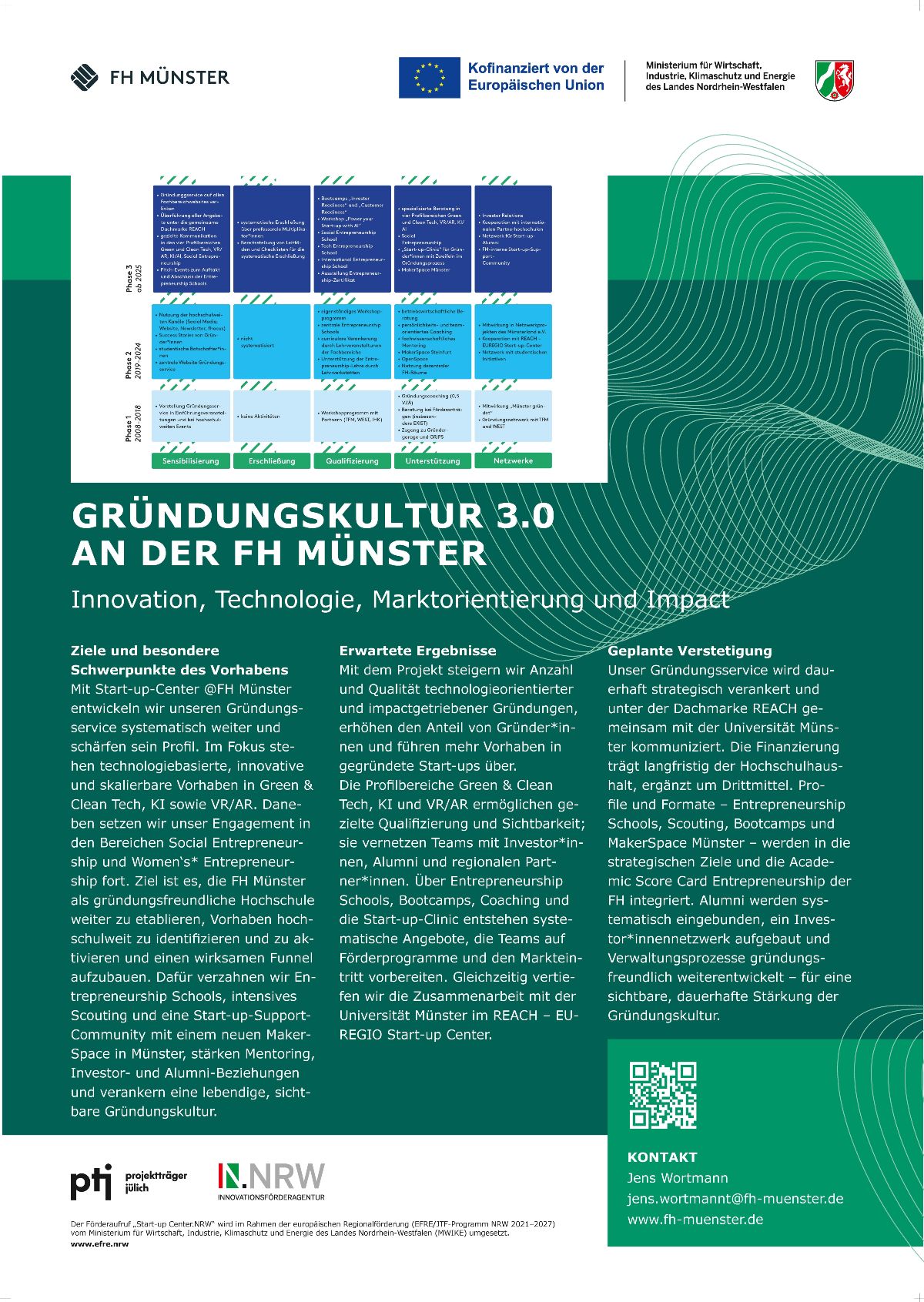 Die Fachhochschule Münster wurde im Juli 2025 im Rahmen der Landesinitiative „Start-up Center.NRW“ ausgewählt. Sie wird im Rahmen ihres Projekts "Start-up-Center@FH Münster" ihre Gründungskultur weiterentwickeln und ihr Angebot für gründungsinteressierte Studierende, Forschende und Mitarbeitende ausbauen. Das Ziel: Anzahl und Qualität von Hochschul-Ausgründungen steigern und damit die Rolle der Hochschulen als Impulsgeber im Start-up-Ökosystem Nordrhein-Westfalens nachhaltig stärken.