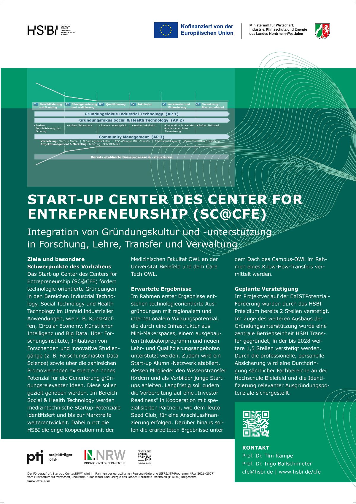 Die Hochschule Bielefeld wurde im Juli 2025 im Rahmen der Landesinitiative „Start-up Center.NRW“ ausgewählt. Sie wird im Rahmen ihres Projekts "Start-up Center des Center for Entrepreneurship (SC@CFE)" ihre Gründungskultur weiterentwickeln und ihr Angebot für gründungsinteressierte Studierende, Forschende und Mitarbeitende ausbauen. Das Ziel: Anzahl und Qualität von Hochschul-Ausgründungen steigern und damit die Rolle der Hochschulen als Impulsgeber im Start-up-Ökosystem Nordrhein-Westfalens nachhaltig stärken.