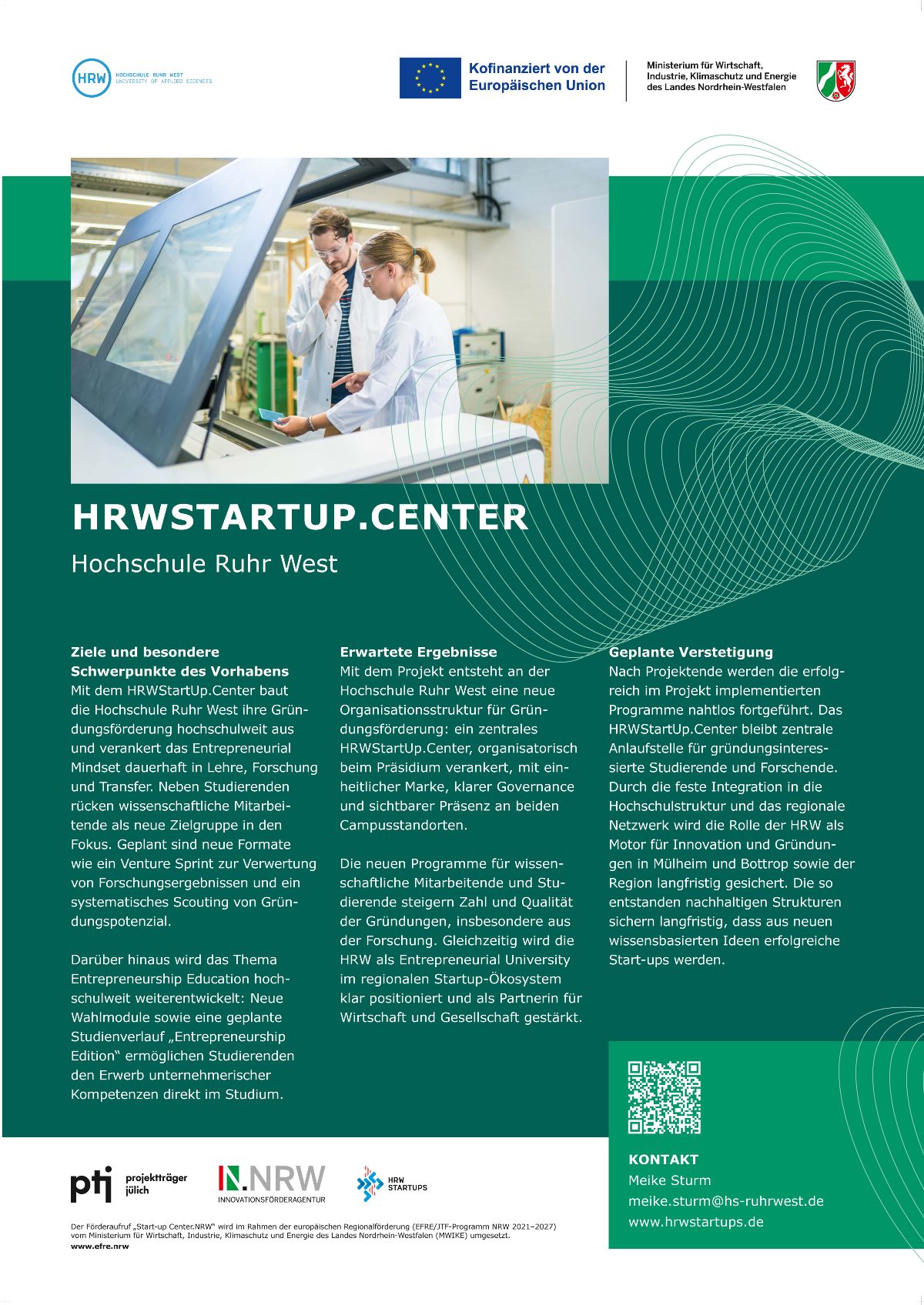Die Hochschule Ruhr-West (HRW) wurde im Juli 2025 im Rahmen der Landesinitiative „Start-up Center.NRW“ ausgewählt. Sie wird im Rahmen ihres Projekts "HRWStartUp.Center" ihre Gründungskultur weiterentwickeln und ihr Angebot für gründungsinteressierte Studierende, Forschende und Mitarbeitende ausbauen. Das Ziel: Anzahl und Qualität von Hochschul-Ausgründungen steigern und damit die Rolle der Hochschulen als Impulsgeber im Start-up-Ökosystem Nordrhein-Westfalens nachhaltig stärken.
