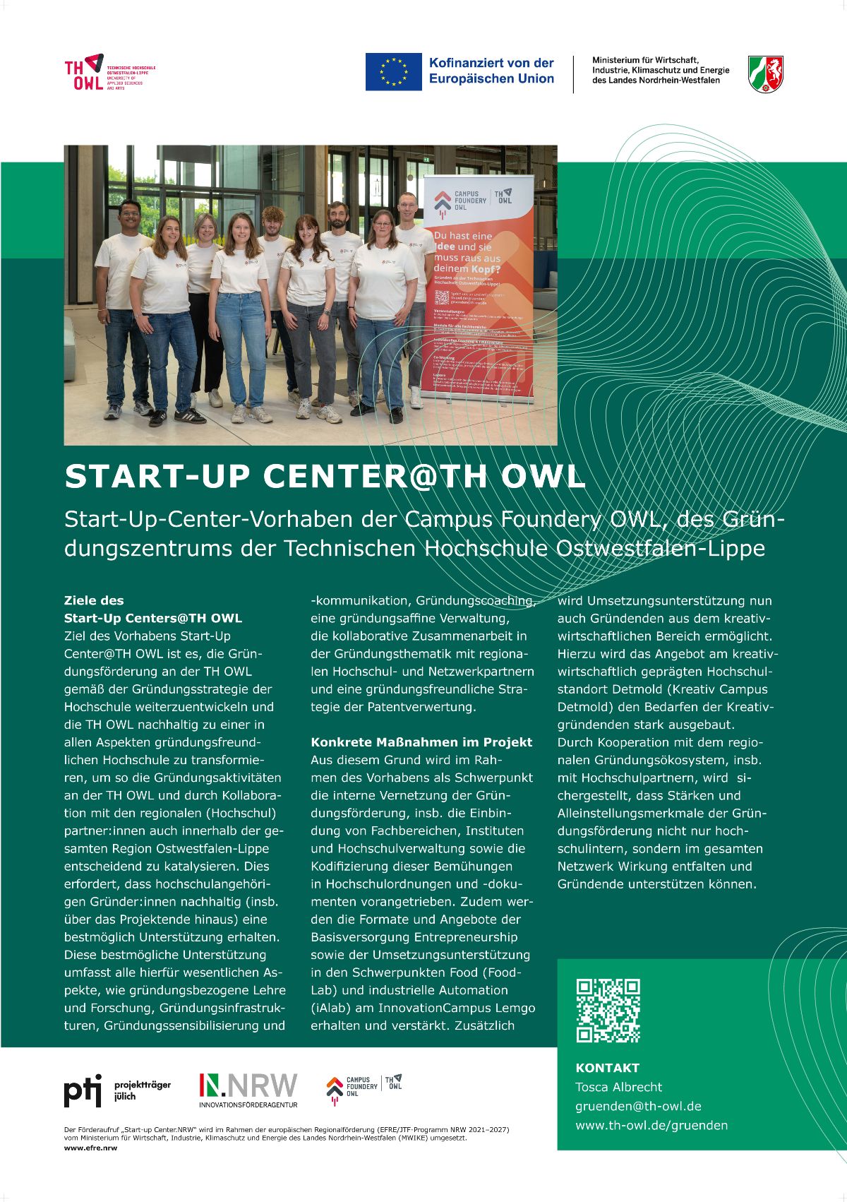 Die Technische Hochschule Ostwestfalen-Lippe (TH OWL) wurde im Juli 2025 im Rahmen der Landesinitiative „Start-up Center.NRW“ ausgewählt. Sie wird im Rahmen ihres Projekts "Start-Up Center@TH OWL" ihre Gründungskultur weiterentwickeln und ihr Angebot für gründungsinteressierte Studierende, Forschende und Mitarbeitende ausbauen. Das Ziel: Anzahl und Qualität von Hochschul-Ausgründungen steigern und damit die Rolle der Hochschulen als Impulsgeber im Start-up-Ökosystem Nordrhein-Westfalens nachhaltig stärken.