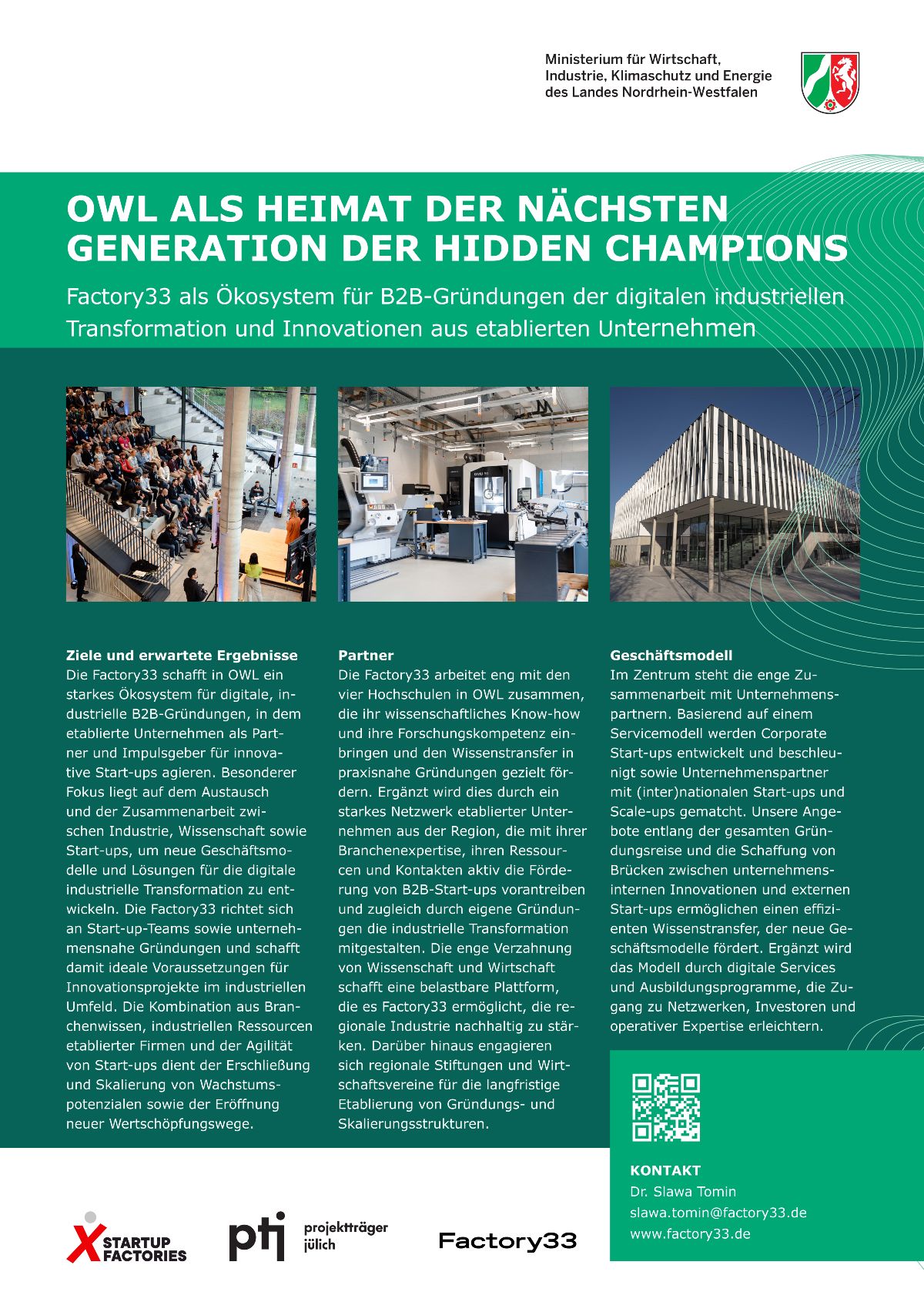 Die Factory33 schafft in Ost-Westfalen (OWL) ein starkes Ökosystem für digitale industrielle B2B-Gründungen, in dem etablierte Unternehmen als Partner und Impulsgeber für innovative Start‑ups agieren. Ziel ist es, sowohl Anzahl als auch Qualität von B2B-Start-ups zu steigern und von der Gründungsidee bis hin zur Skalierung zu beschleunigen. Durch eine verstärkte Zusammenarbeit zwischen Wissenschaft, Privatwirtschaft und Kapitalgebern in regionalen High-Potential-Gebieten wird das Start-up-Ökosystem nachhaltig gefördert und dynamisiert.
